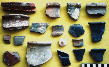 Es handelt sich um blau und türkis glasierte Scherben. Einige Scherben